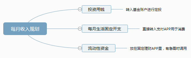 每月发薪日一收到工资,我就会把它分成三部分:投资用钱、每月生活固定开支、流动性资金。