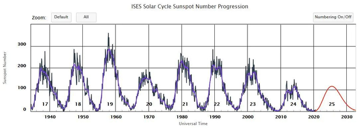 科学界对太阳活动周的编号大概是从18世纪开始的,目前已经进入第25个周期。上一次的太阳活动极大期是在2014年4月,而极小期就是2019年12月。
