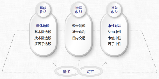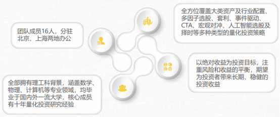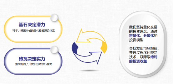 投资策略:运用数量分析和对冲手段构建投资组合,降低系统性的市场风险,获得稳定收益;实质是找出市场效率的缺失点,通过带有套利性质的交易达到投资的稳定性、低波动率以及市场中性的目的。