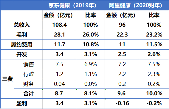 在两家都比拼自营的情况下,以自营起家的京东在运营效率上要明显更甚一筹,毛利率更高,履约费用(主要是物流)、三费都更低,从而能够在盈利上拉开差距。