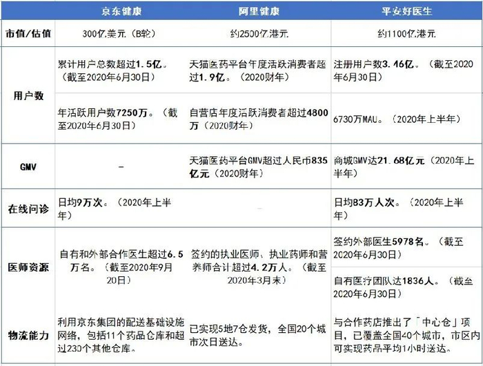 这三家公司各有千秋:京东健康自营店优势很大,阿里健康用户数规模最大,平安好医生在问诊领域优势非常明显。平安好医生和阿里健康充满着“卖药”的电商基因,平安好医生的母公司是中国平安,比较注重金融和服务。