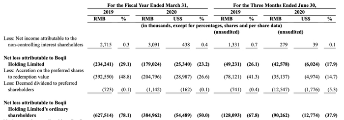 把时间轴拉开到三年前,2018年至今,波奇宠物的营收和净利润年年下滑。2018财年、2019财年的营收分别为8.04亿元与7.7亿元,2020年一季度(2020年4月-6月,下同)营收为2.38亿元,营收持续下滑;净利润方面,2018年-2.3亿元,2019年-1.76亿元,今年上半年第一季度-4230万元,近27个月已累计亏损4.5亿元。