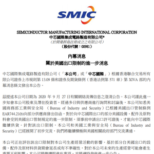 10月4日晚间,据港交所网站最新消息,中芯国际今天就网传信息发布公告称,中芯国际已知悉,美国商务部工业与安全局根据美国出口管制条例向部分供应商发出信函,对向中芯国际出口的部分美国设备、配件及原物料会受到美国出口管制规定的进一步限制,须事前申请出口许可证后,才能向中芯国际继续供。