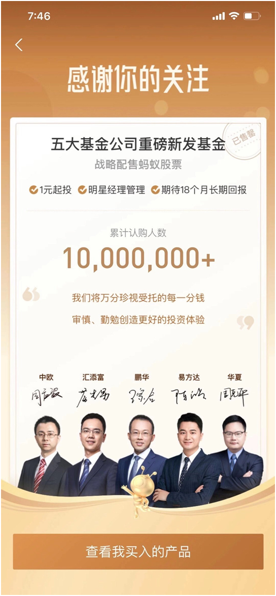 而到了仍处于双节长假期间的10月8日晚间,支付宝上销售的战略配售蚂蚁页面在晚间已经悄然隐没,这五只基金已经全部售罄,累计认购人数超千万。