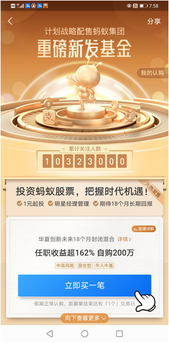 早在10月8日早上8点左右,基金君还能在支付宝页面上寻找到华夏创新未来18个月混合基金发行的身影。当时投资参与蚂蚁战略配置基金的累计关注人数已然超过了千万大关。