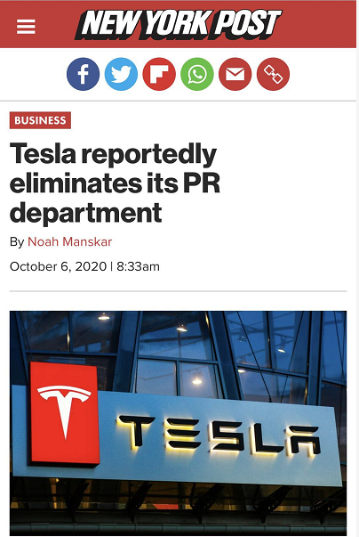 据《纽约邮报》等多家外媒报道,近日,特斯拉最高层向外界媒体透露,特斯拉公司已经解散了其在美国总部的公关团队。