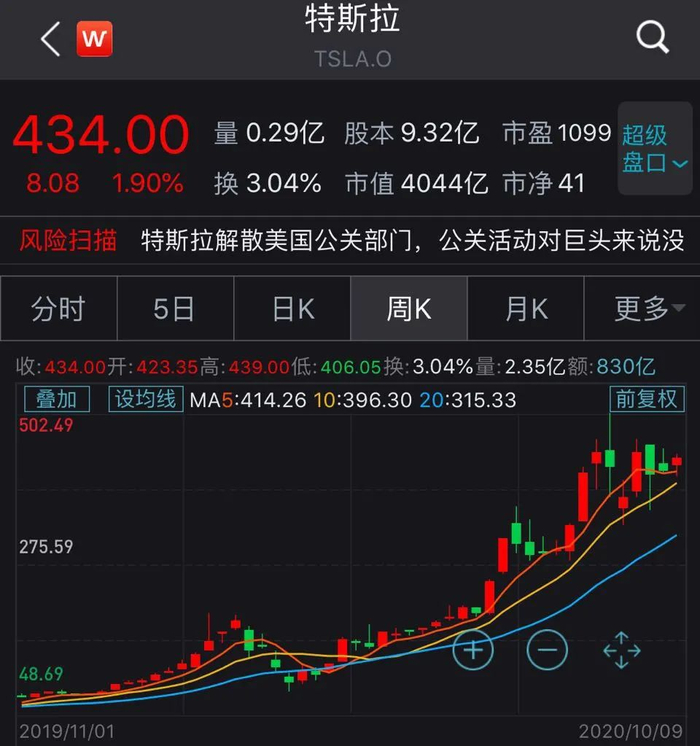 今年年初以来,特斯拉的股价由85美元左右的价格一跃突破400美元的大关,暴涨约420%,近250日涨跌幅更是高达775%,截至上周美股收盘,该股股价已达到434美元,市值突破4000亿美元大关(约合2.72万亿人民币)。