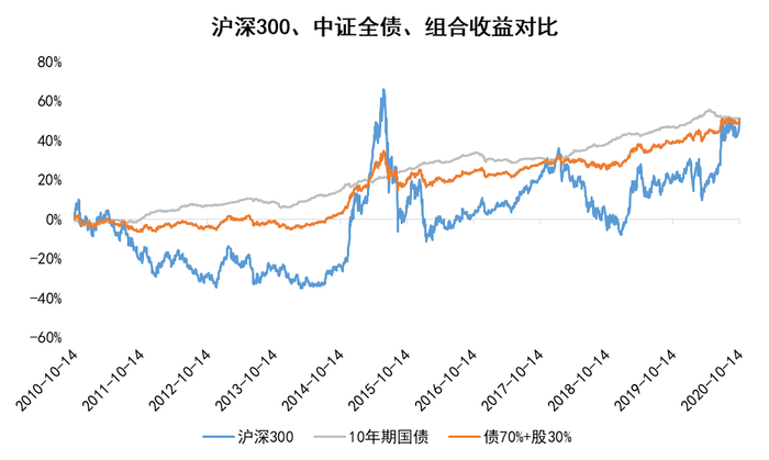 这里我们以70%中证全债指数+30%沪深300为例。过去十年,对比投资组合的收益走势与沪深300、中证全债的收益走势,可以发现,投资组合表现较沪深300指数的历史表现更稳健,且长期能够达到明显的平衡风险、适度增收的效果。