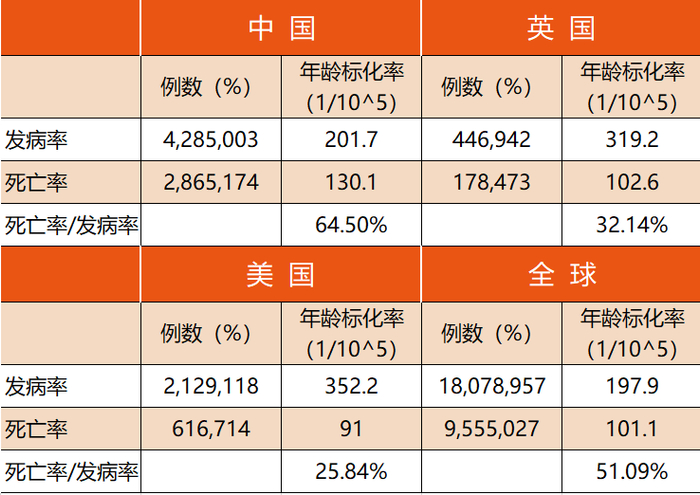 从发病率来看,中国癌症发病率(201.7/十万人)仅略高于全球平均水平(197.9/十万人),低于英国癌症发病率(319.2/十万人)和美国癌症发病率(352.2/十万人),但是死亡率却远高于英美。