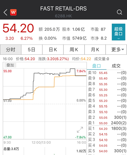受消息影响,今日迅销(6288.HK)复牌后表现强势,截至收盘,报54.2港元,涨6.27%,最新总市值为5749亿港元。