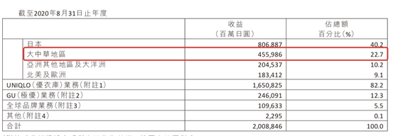 分地区来看,截至2020年8月31日,据迅销集团披露的数据来看,日本本土的销售收益为8068.87亿日元,占比为40.2%;而中国地区销售收益为4559.86亿日元,占比为22.7%。