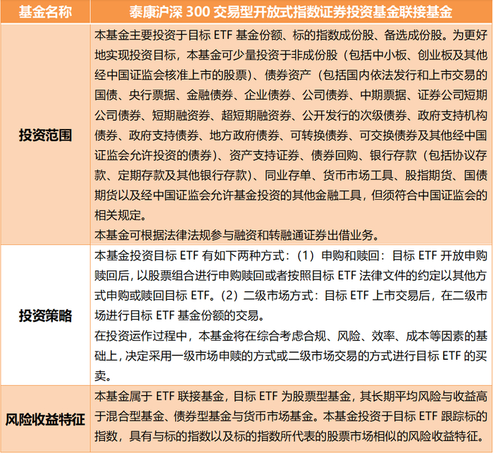 泰康沪深300ETF比较适合有经验的场内基金投资者;如果您习惯了购买场外基金,则可以选择泰康沪深300ETF联接基金,无需开通股票账户即可申购。