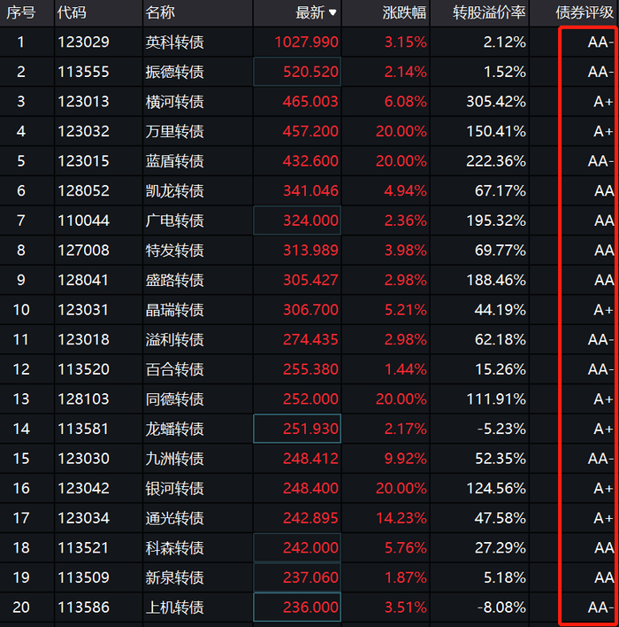 可转债也是债券,也会有评级,虽然目前可转债还没有违约的,但将来一定会有。由于可以不断向下调整转股价,降低转股的难度,所以只要股票不退市,可转债的违约风险就还可控,但即便如此,一些AA-、A+的垃圾转债,公募基金等机构还是不会碰的,不是说不赚钱,而是一旦出事声誉风险太大。这还是放宽松了,要是普通的信用债,大部分公募基金最差只能到AA+。