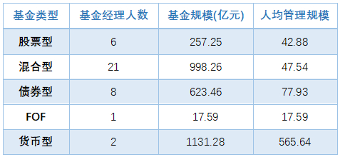 中欧基金公司有基金经理28人,有权益类基金经理24位,其中管理规模超过百亿的经理有7位;固收类基金经理人数为8人,其中5人的管理规模在160亿至340亿之间,具体分类管理规模如下表所示: