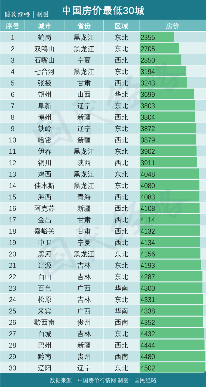 这些低房价城市,主要集中在以黑龙江鹤岗、双鸭山,宁夏石嘴山,辽宁铁岭、阜新,甘肃张掖为代表的收缩型城市或偏远城市。这在《房价最低30城》一文中有详细论述。