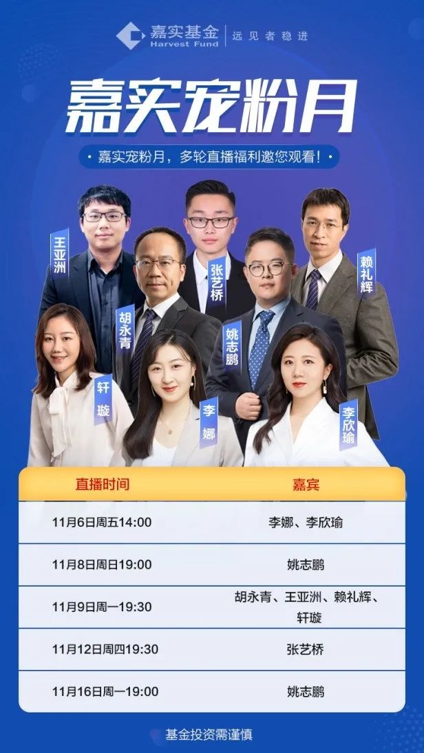 未来债市、股市如何看?对于市场持续震荡,投资者该何去何从?本月直播活动,嘉实固收投资总监,固收+CIO胡永青,嘉实基金制造行业投资总监姚志鹏,投资顾问张艺桥,高端客户顾问杨俊雅、李欣瑜、李娜、余律,美女主播晓欧姐姐、钱多多,将一一亮相直播间,邀您一起观看直播!