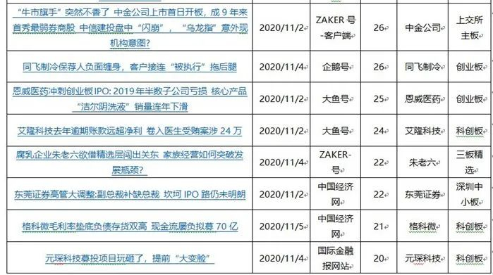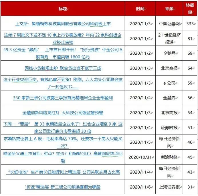 据全景数据监测显示,10月31日至11月6日期间,IPO企业相关新闻共有15732条。本期市场关注热点有:“上交所:暂缓蚂蚁科技集团股份有限公司科创板上市”;“连续7周批文下发不足10家上市节奏放缓?年内22家科创板企业终止审核”;“49.3亿资金‘激战’ 上市首日即开板!‘投行贵族’中金公司A股首秀”;“330家新三板公司披露三季报首批精选层企业全部盈利”、“陆金所火速上市背后:时点?定价?和蚂蚁可比?高管回应热点问题”、“ ‘长虹电池’生产商长虹能源拟上精选层 公司关联交易占比高”等。