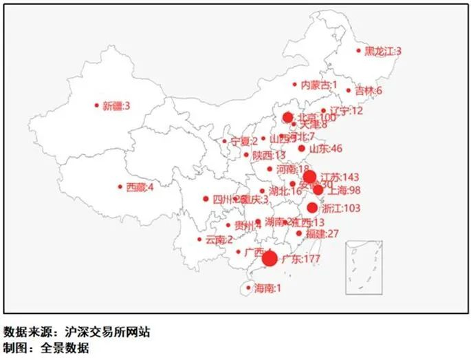 据上交所和深交所网站公开数据显示,已经信息披露的903家企业覆盖北京、上海、广东、浙江、江苏等29省市自治区,其中,广东、江苏、浙江三地企业存量均超百家,分别是177家、143家以及103家。