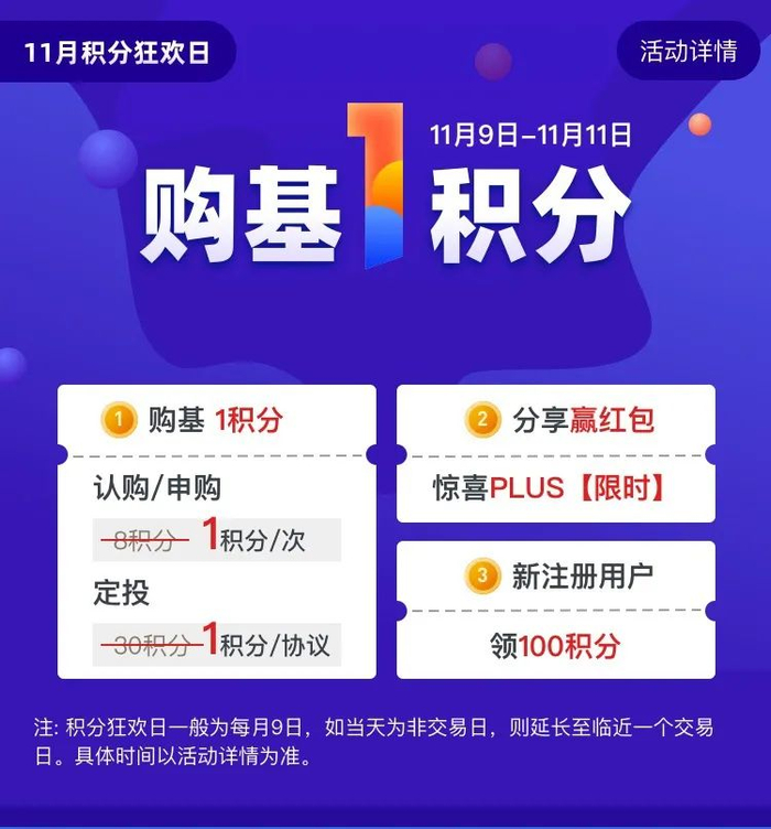 小夏温馨提示:活动结束后,积分抵扣规则将恢复为8积分抵扣1次认/申购费,30积分抵扣1个新建定投协议存续期间的每一次定投申购费(招行卡除外)。