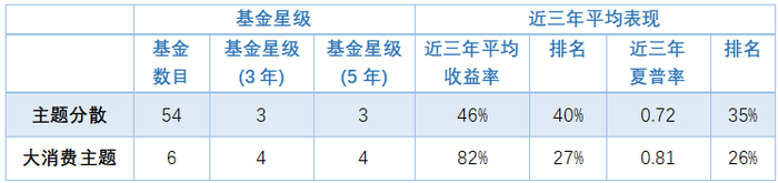 大消费主题的基金有6只,近三年收益排名在前30%,夏普率排名也在前30%。