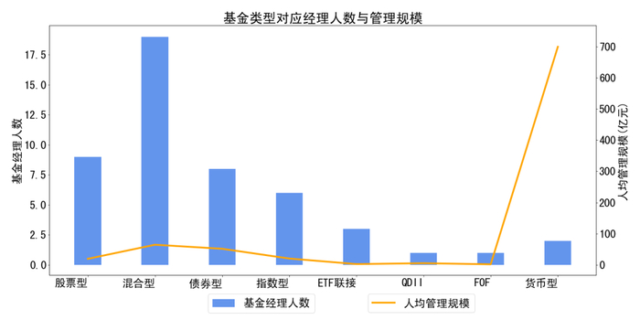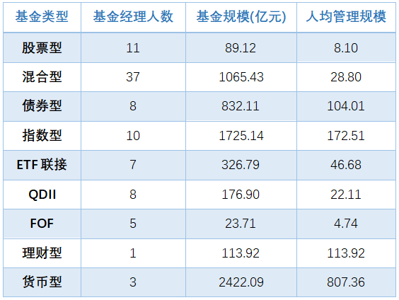 景顺长城旗下共有基金经理28人。管理混合型基金的基金经理人均管理规模为28.8亿。管理非货币理财基金的基金经理中,管理指数型、债券型基金的基金经理人均管理规模超过百亿。具体分类管理规模如下表所示: