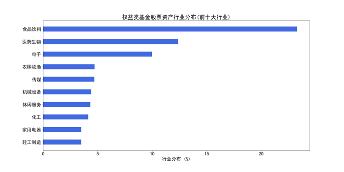 对景顺长城所有权益类基金的股票资产进行市值加权计算,权重最高的行业是食品饮料,达到了23%,其次是医药生物和电子,分别占比12%和10%。其余行业的权重均不到5%。