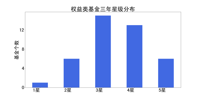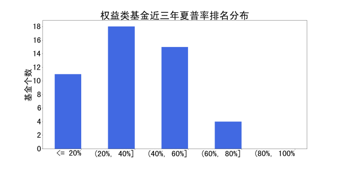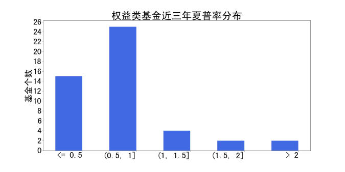 从近三年权益类基金的夏普比率看,在0.5 – 1的基金最多,有25只。夏普率超过2的基金有2只,处于1.5 – 2的也有2只。夏普率排名位于前20% - 40%的基金最多,有18只,无位于后20%的基金。从基金星级来看,三年星级在3星的最多,有15只,其次是4星的基金,有13只,且仅有1只1星基金。