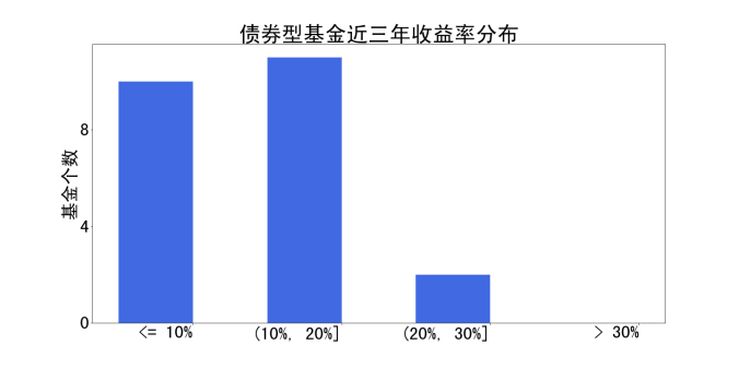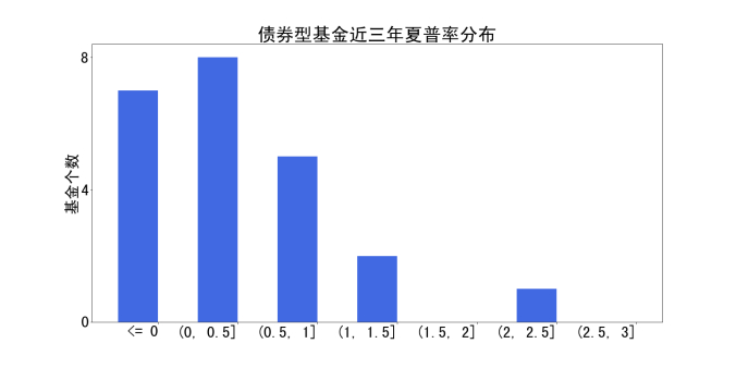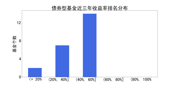再看债券型基金,近三年收益多集中在小于10%和10%-20%。收益排名处于中间档(60% - 80%)的债基最多,有14只,无收益处于后40%的债基。近三年夏普率在0-0.5的基金最多,排名处于中间档(60% - 80%)的债基同样最多,有12只,无夏普率处于后40%的债基。