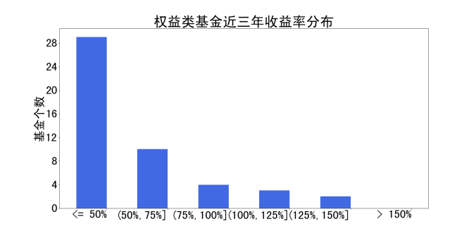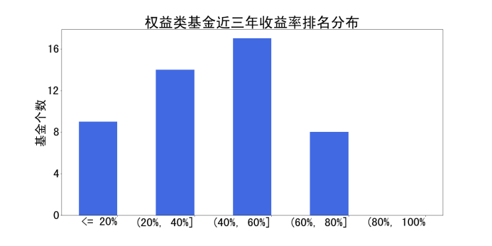 先看权益类基金近三年的收益表现。累计收益在50%以下的数量最多,其次是收益在50%-75%之间的基金,也不乏收益超过100%的基金。近三年累计收益在全市场权益类基金中排名处于前20%的有9只,而位于中间档(40% - 60%)的基金数量最多,有17只,无处于后20%的基金。