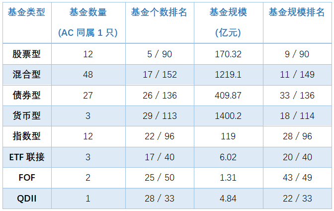 从基金类型的分布来看,景顺长城旗下基金数量最多的为混合型(规模排名第11位),股票型基金的个数排名全市场第5位,规模排名第9位。