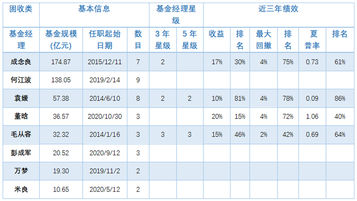 固收类基金经理人数为8位,其中成念良和何江波的管理规模超过100亿。在有3年业绩的固收类基金经理中,董晗经理的收益表现最好,在全市场债券类基金经理中排名前15%,夏普率也最高。而毛从容经理的最大回撤控制得最好。
