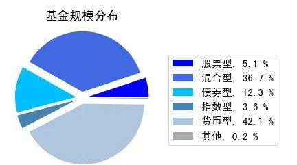从基金规模分布来看,货币型最大,占42.1%,其次是混合型,占比36.7%,其次为债券型,占比12.3%。股票型、指数型的规模合计占比为8.7%。