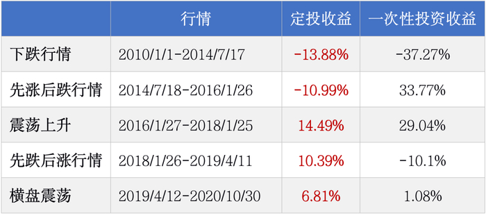 (来源:u8定投计算器、wind,统计区间:2010/1/1-2020/10/30,定投金额:1000元/月,定投模拟标的:上证指数)
