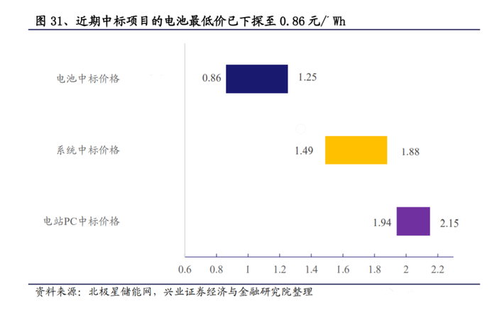 光伏并网对储能的最核心的要求就是,绝对价格足够低,这个价格指的是全成本。我们看兴业证券整理的光伏储能电站中标项目报价情况,如下图: