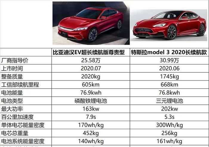 比亚迪的汉EV,电芯能量密度是170wh/kg,组成电池组之后电池的系统能量密度就降到了140wh/kg,成组效率为82.53%;特斯拉最新的model 3 长续航版,电芯采用松下的21700电池,电芯能量密度比比亚迪汉EV采用的磷酸铁锂刀片电池近乎高一倍。