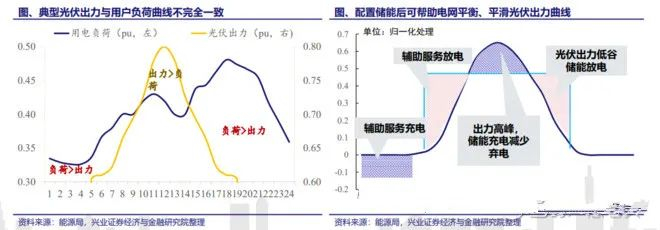 这个图来自于兴业证券电力设备研究员朱玥的报告:《成长锋芒,中国力量》。光伏发电要想突破这个30%-40%的上限,就需要配置储能设施,在中午发电高峰期把电力储存起来,到晚上用电高峰期把电放出来,这样就可以彻底淘汰掉煤和天然气,只用光伏全天候满足整个电网的需求。