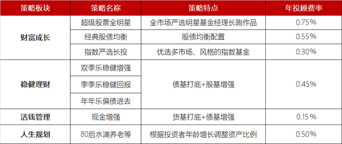 做短期理财的现金增强策略,投顾费率是最低的,只有0.15%/年。而超级股票全明星,在全市场严选偏股型明星基金经理的长跑作品,费率最高,是0.75%/年。