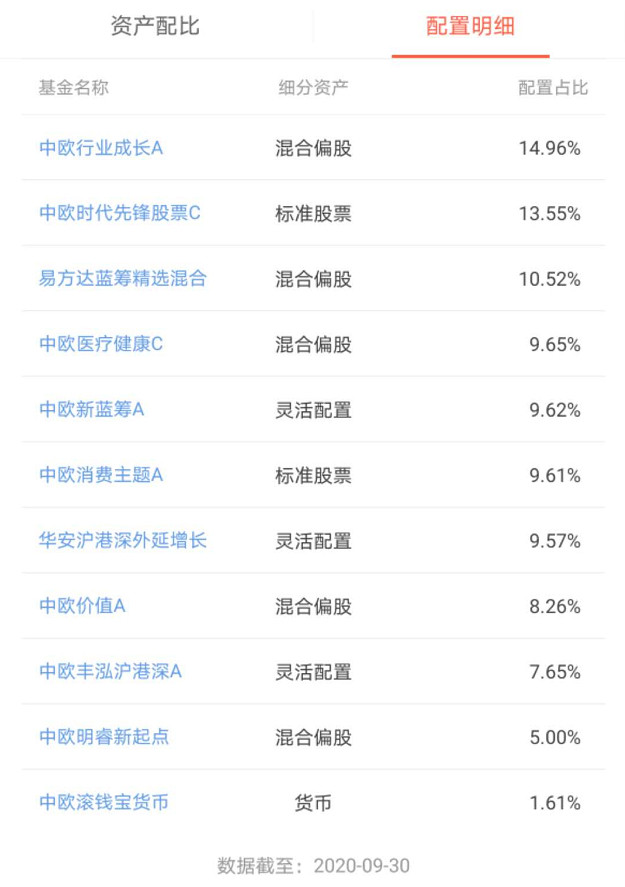 超级股票全明星目前的持仓基金包括中欧行业成长、中欧时代先锋、易方达蓝筹精选、中欧医疗健康等等一系列基金(见下图):