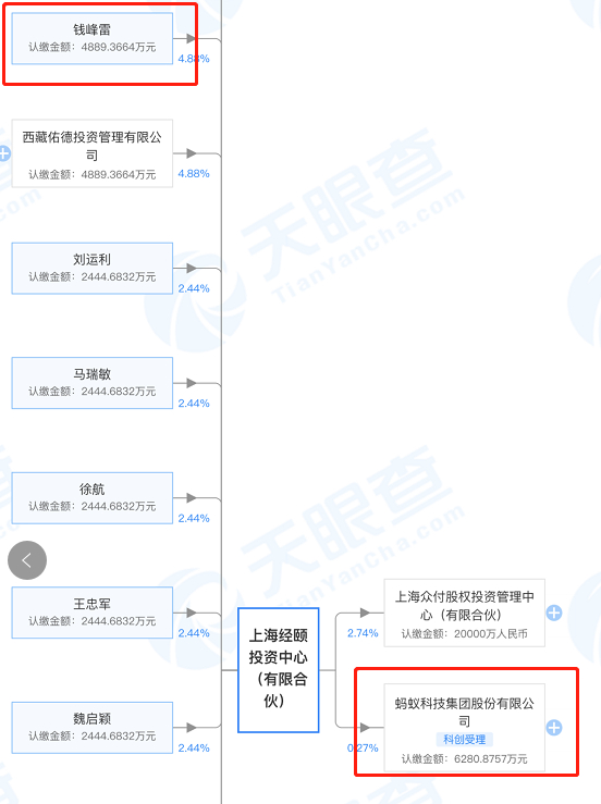 天眼查数据显示,钱峰雷是蚂蚁集团的股东之一。