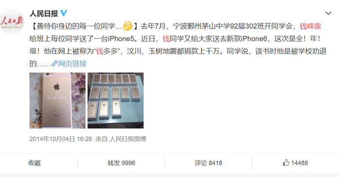 在2014年的时候,钱峰雷还因为在同学会上给每个同学送iPhone火过一段时间。