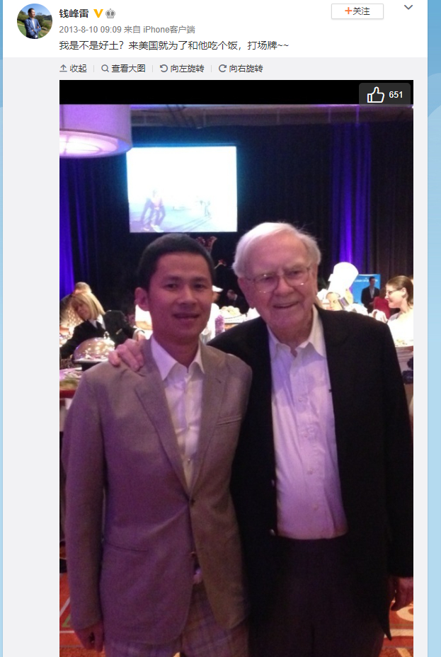 另外,还在微博晒出跟巴菲特的合照。