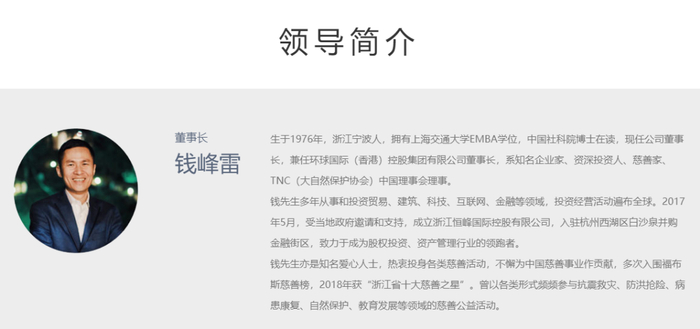 据恒峰国际官网介绍,钱峰雷生于1976年,浙江宁波人,拥有上海交通大学EMBA学位,中国社科院博士在读,现任公司董事长,兼任环球国际(香港)控股集团有限公司董事长,系知名企业家、资深投资人、慈善家、TNC(大自然保护协会)中国理事会理事。