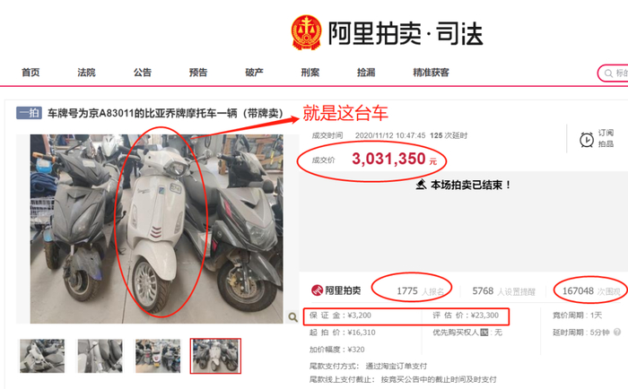 阿里拍卖网站显示,车牌号为京A83011的比亚乔牌摩托车一辆(带牌卖),11月12日上午拍卖结束,成交价高达303.14万元。由北京市第三中级人民法院发布公告进行司法拍卖。