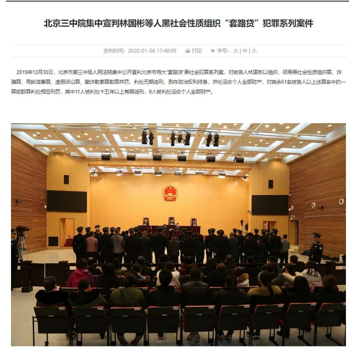 根据今年1月初北京三中原发布的案件快报,集中宣判林国彬等人黑社会性质组织“套路贷”犯罪系列案件。