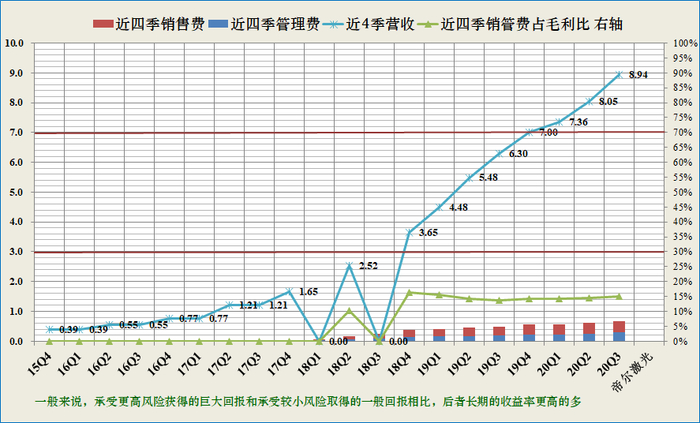 投资者可关注近四季销售和管理费用与毛利润之比持续小于30%的公司(绿线低于下红线为优异,靠近为优秀),具备较高的竞争优势,若30-70%之间为可接受区域(图中红色直线之间),若大于70%需要警惕,说明该公司产生净利润的能力较弱。