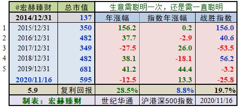 2014年末至今5个整年度段里3年市值增长战胜指数,胜率【60%】,今年以来暂时落后指数。