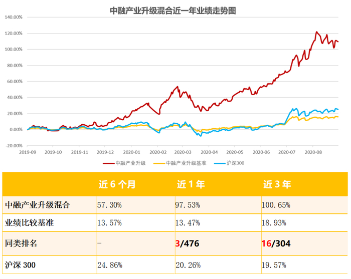 中融产业升级混合(基金代码:001701):布局新经济、新动能,聚焦制造业崛起。2016年3月18日基金成立,截至2020年9月30日净值为2.155,近一年总回报率达97.53%,远超同期业绩比较基准和沪深300指数涨幅,同期排名3/476。