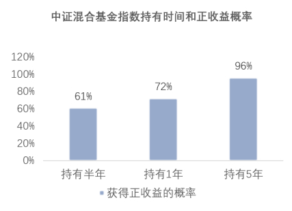 毕竟,基金定投就像是一场马拉松,这称号有如探囊取物。以中证混合基金指数为例,从2008年到2019年的数据看,持有半年正收益的概率是61%,持有一年正收益的概率提高到72%,而持有5年正收益的概率便达到了96%。