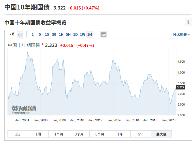 10年期国债收益率又即将来到历史中枢位置(考虑到宽松的环境,以后10年期国债收益率的价值中枢有下移趋势)。图标出处:英为财情