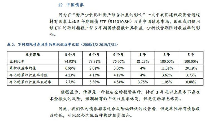 随着时间的推移,债券的波动率下降,收益的确定性增强。出处:上海证券姚慧,《投资期限对资产组合收益的影响:ETF助攻家庭资产配置系列报告之二》